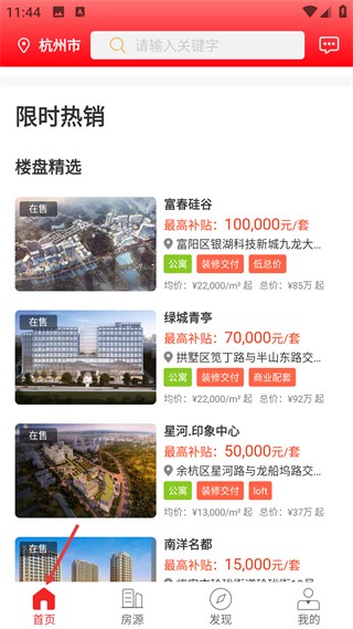 2、登錄后進入首頁,瀏覽限時熱銷的樓盤精選列表,查看各樓盤的補貼、價格等信息,推進看房的相關操作。