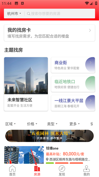 3、切換到房源頁面,通過主題找房功能篩選需求,查看對應的房源詳情,利用篩選條件細化找房范圍。
