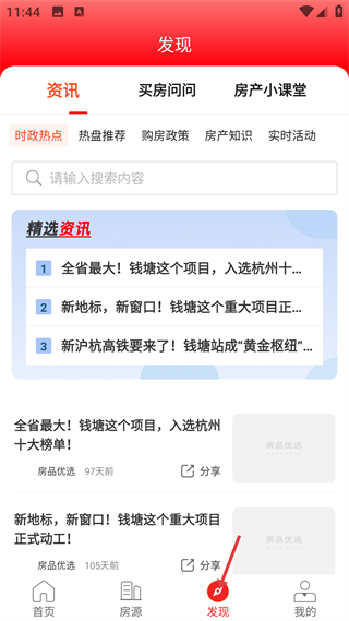 4、進入發現頁面,瀏覽房產資訊、購房政策等內容,了解行業動態,輔助完成看房及購房的相關決策。