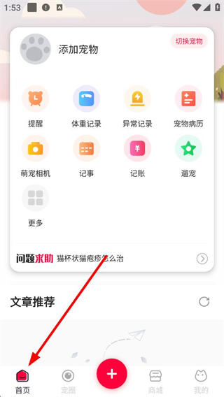 1、首頁可添加寵物,使用提醒、體重記錄、異常記錄等寵物管理功能,還有萌寵相機、記事、記賬、遛寵等服務,提供寵物問題求助和文章推薦。