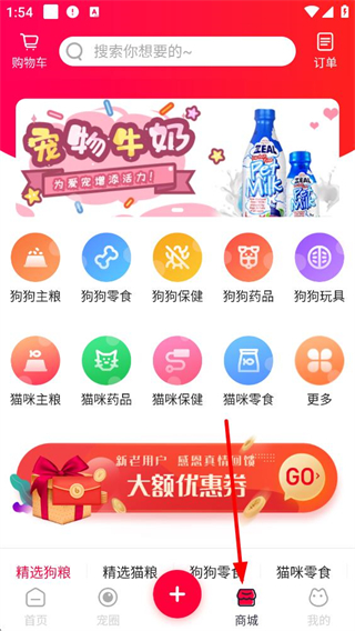 4、商城板塊提供狗狗主糧、零食、保健、藥品、玩具及貓咪主糧、藥品、保健、零食等寵物商品,還有大額優惠券活動,滿足寵物購物需求。