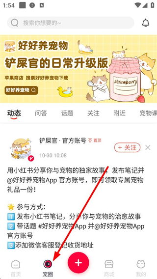 3、寵圈板塊有動態、問答、話題等內容,用戶可參與寵物相關互動,如分享與寵物的故事、參與話題討論等,還能關注官方賬號獲取福利。