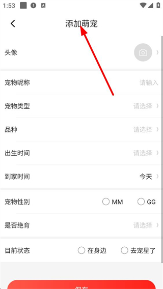 2、添加萌寵時可設置頭像、寵物昵稱、類型、品種、出生時間、到家時間、性別、是否絕育及目前狀態,方便用戶記錄寵物信息。