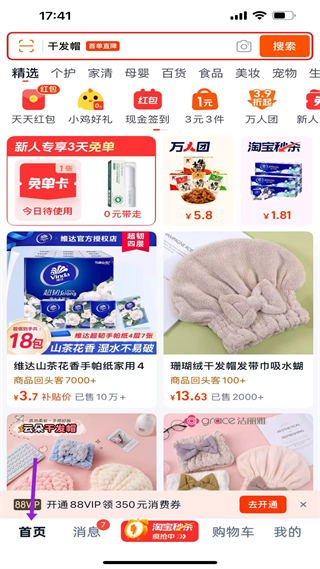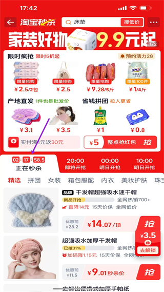 3、淘寶秒殺頁,呈現限時秒殺活動,含多類商品,分時段展示秒殺狀態,提供干發帽等商品的低價搶購入口。