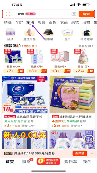 2、家清分類頁,聚焦家居清潔品類,細分多子分類,展示低價爆款商品,標注直降優惠與銷量,滿足家居采購需求。