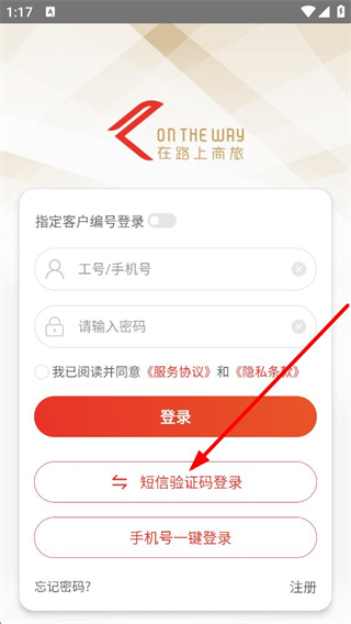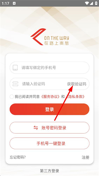 2、選擇短信驗證碼登錄后,需填寫綁定的手機號,點擊獲取驗證碼并輸入,確認協議后點擊登錄,即可進入應用使用差旅相關服務。