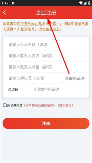 3、企業用戶可進入企業注冊頁面,填寫公司名稱聯系人信息及手機號,獲取并輸入驗證碼,勾選協議后點擊注冊,完成企業賬號開通。