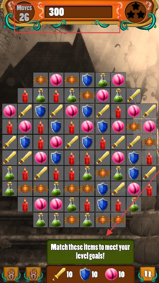2、在Level1的關卡準備界面,點擊PLAY按鈕進入消除場景,看到帶有各類物品的方格矩陣,準備按照提示進行消除操作。