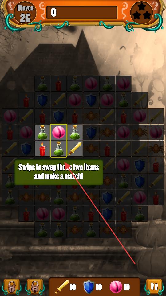 3、進入消除場景后按照提示滑動交換兩個物品,使相同的物品連成一組進行消除,留意操作提示和可移動次數,逐步完成消除任務。