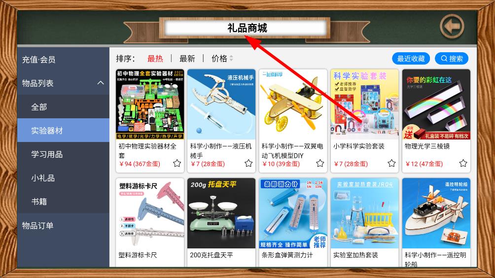 4、點擊界面的商城按鈕進入禮品商城,可瀏覽實驗器材、學習用品等商品,支持按最熱、最新等排序查看,也能使用搜索功能查找所需物品。