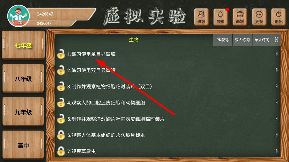 3、登錄后進入虛擬實驗主界面,可選擇對應年級,查看生物學科的實驗列表,包含練習使用顯微鏡、制作細胞裝片等實驗,可選擇對應實驗進行操作。