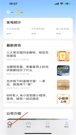 1、首頁,有發電統計板塊今日、本月、累計發電數據待展示,最新資訊板塊展提現解析、暴雨光伏板等資訊,還有公司介紹板塊。