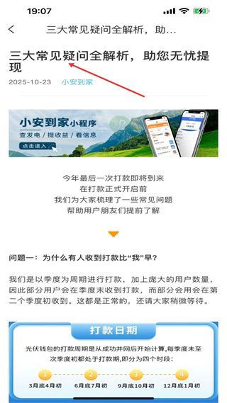2、提現解析資訊頁,標題為三大常見疑問全解析,助您無憂提現,介紹光伏錢包打款周期,梳理打款常見問題。