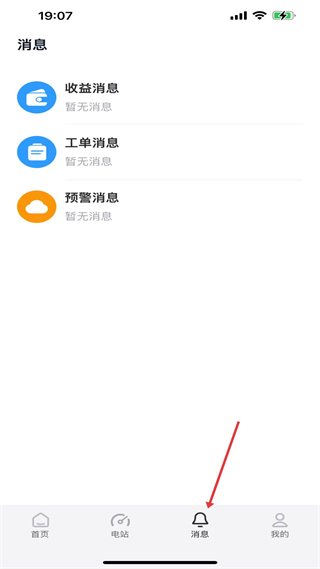 4、消息頁分為收益消息、工單消息、預警消息三類,當前均顯示暫無消息,用戶可在此查看各類光伏相關消息通知。