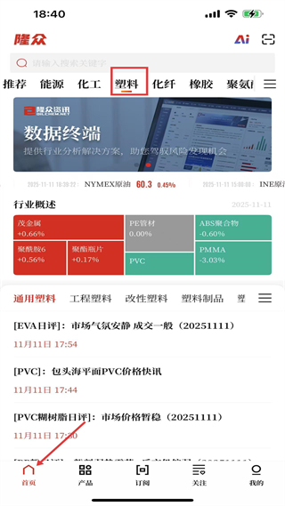 1、首頁塑料板塊設分類,有數據終端入口,展示產品行業概述及EVA等日評,呈現塑料市場行情分析。