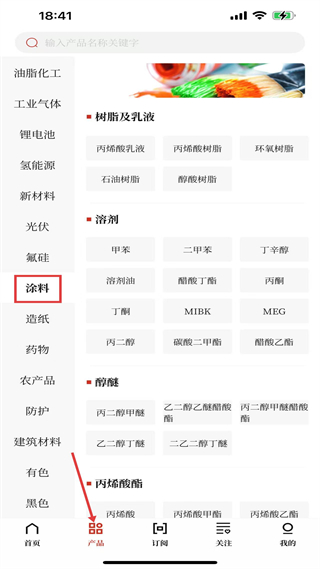 2、產品涂料板塊屬化工大類,含樹脂及乳液等領域,溶劑類有甲苯等產品,方便查詢涂料產業信息。