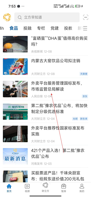 2、登錄后進入首頁,可通過搜索框查找內容,也能點擊食品投融等分類標簽,瀏覽展示的資訊列表,選擇感興趣的資訊內容進行查看。
