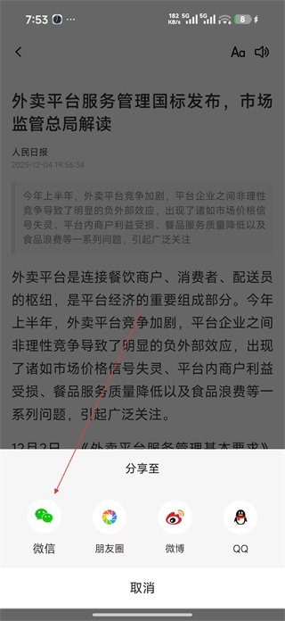 4、在資訊詳情頁點擊分享按鈕,選擇微信朋友圈等分享渠道,將該資訊內容分享給微信的朋友。