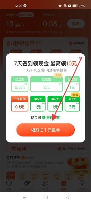 4、進入賺錢板塊可參與7天簽到領現金活動,點擊領取0.1元現金按鈕,領取簽到獎勵,還可查看日常福利如看視頻領金幣等,參與福利活動獲取收益。