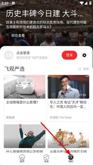 1、進入飛觀應用后,首頁可瀏覽發現、嚴選等各類內容,還有動態、我的等功能入口,能獲取紀錄片、觀點資訊等多樣服務。