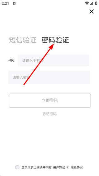 4、也可選擇密碼驗證登錄,輸入手機號和密碼,勾選用戶協議和隱私協議后點擊立即登陸,若忘記密碼可點擊忘記密碼找回。