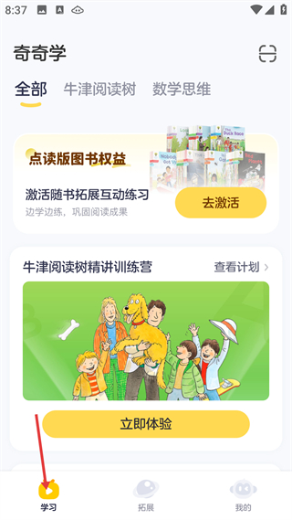 1、學習模塊頁,涵蓋牛津閱讀樹等內容,提供點讀版圖書權益激活服務,配套精講訓練營,支持邊學邊練鞏固閱讀成果。