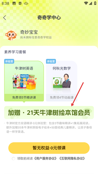2、奇奇學中心頁,提供素養學習套餐體驗營,含牛津樹英語等免費課,加贈繪本館會員,適配兒童啟蒙學習需求。
