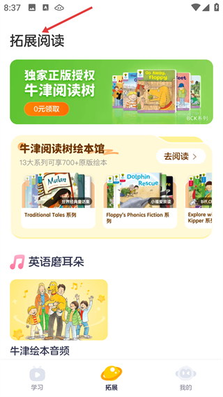 3、拓展模塊頁,含牛津閱讀樹正版資源,提供700原版繪本閱讀服務,配套英語音頻,輔助兒童語言啟蒙學習。