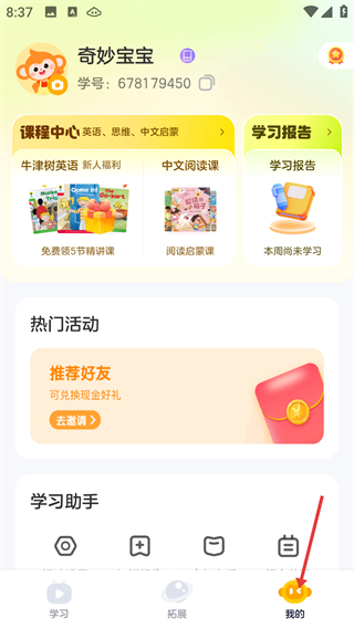 4、個人中心頁,展示課程中心等功能,支持查看學習進度,設熱門活動與學習助手,助力用戶管理學習過程。