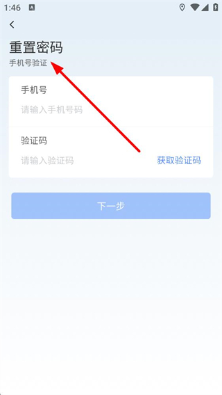 4、若需重置密碼,進入重置密碼頁面,輸入手機號獲取并填寫驗證碼,點擊下一步即可進入密碼設置流程。