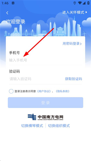 3、進入登錄界面后,可選擇手機號驗證碼登錄方式,輸入手機號獲取驗證碼并勾選協議,即可完成賬號登錄操作。