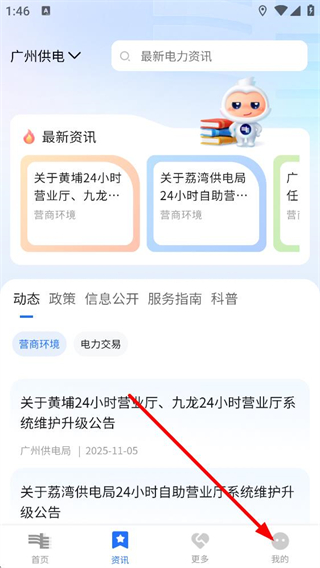 1、資訊頁面查看最新電力資訊,包含營業廳維護公告等內容,點擊底部我的按鈕,可進入個人服務相關功能頁面。