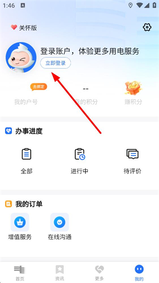 2、進入我的頁面后,能看到登錄提示及我的戶號積分等功能入口,點擊立即登錄按鈕,可進入賬號登錄界面。