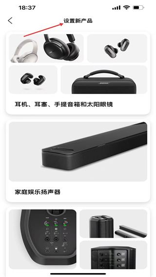 3、設置新產品界面,可選擇耳機、耳塞、手提音箱等類別,根據你的Bose產品類型進行設置。