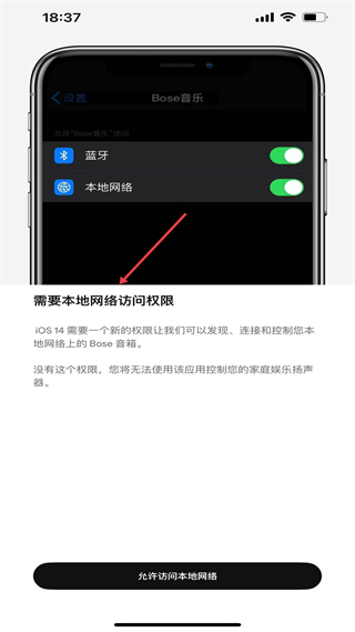 4、iOS14系統需允許Bose音樂訪問本地網絡,否則無法控制家庭娛樂揚聲器,點擊允許訪問本地網絡即可授權。