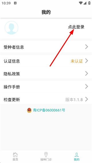 2、我的頁面中,可管理受種者信息、查看認證狀態等,點擊點此登錄區域,即可進入青苗寶的賬號登錄操作界面。