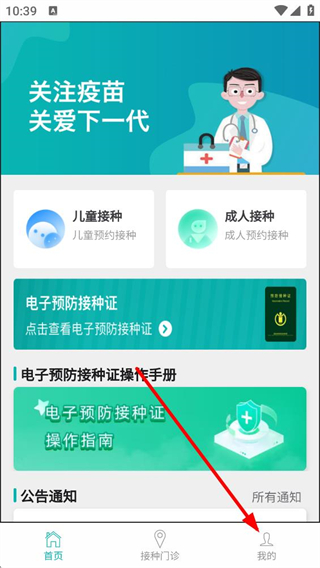 1、進入應用首頁,可選擇兒童接種或接種功能進行疫苗預約,也能查看電子預防接種證及操作手冊,點擊底部我的選項進入個人頁面。