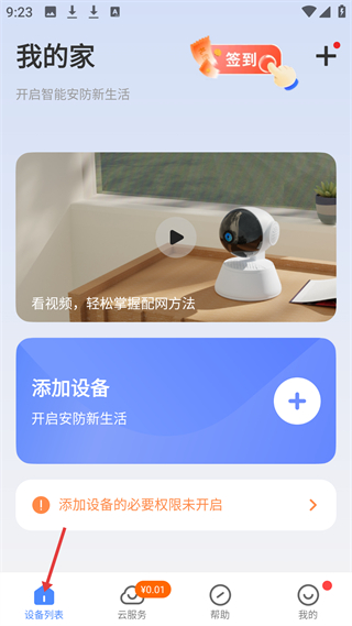 1、設備列表界面,有我的家板塊,可簽到、添加設備,能看配網視頻,提示添加設備必要權限未開啟,用于管理安防設備。
