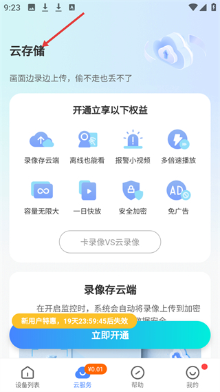 2、云存儲界面,介紹云存儲服務,開通享錄像存云端等多項權益,新用戶有特惠,保障錄像數據安全存儲。