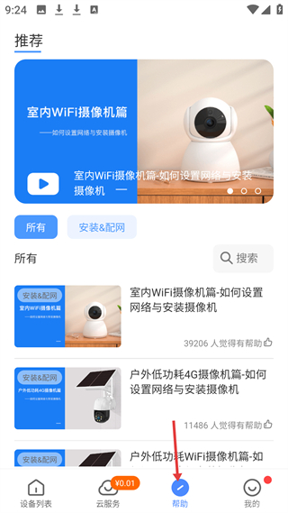 3、幫助界面,推薦室內WiFi、戶外低功耗4G和WiFi攝像機安裝配網教程視頻,幫助用戶解決設備安裝配置問題。