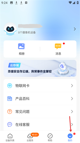 4、個人中心界面,用戶暫無攝像機設備,有相冊、消息功能,可了解云存儲,查看物聯網卡、產品百科等,進行賬號設備管理。