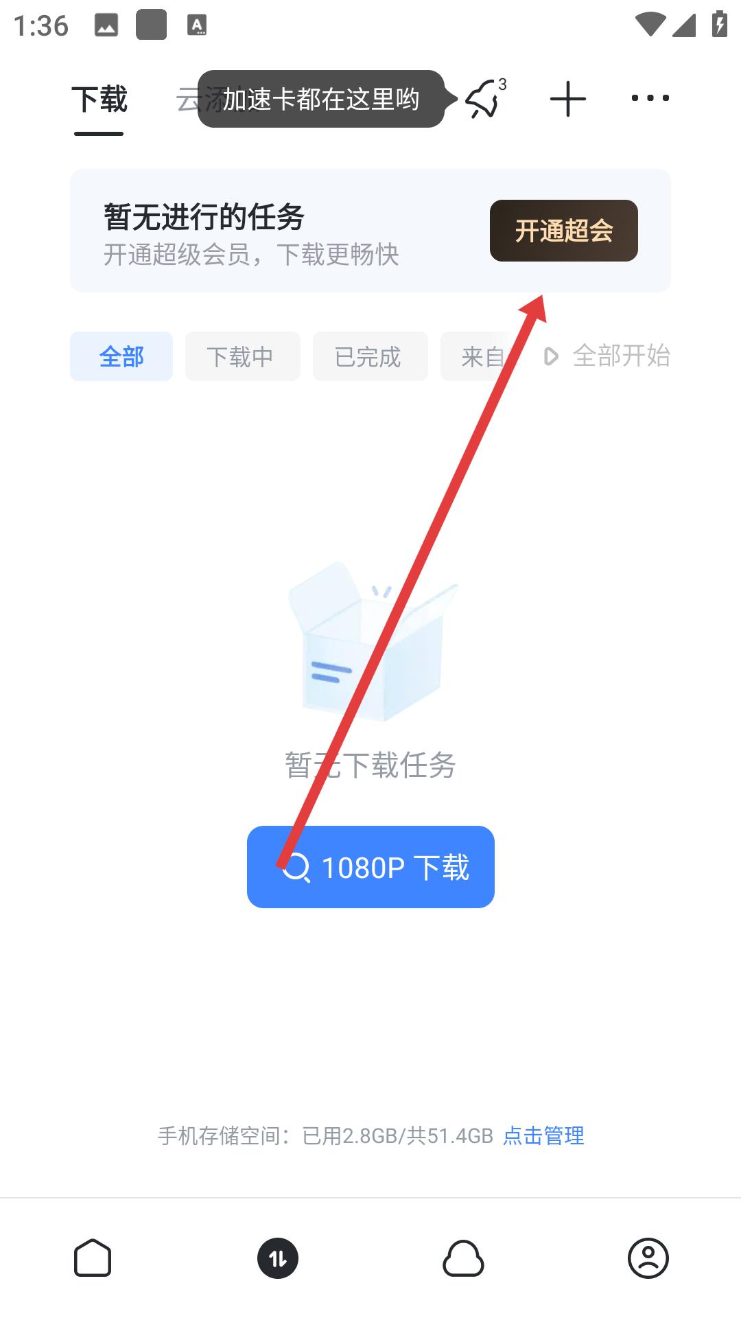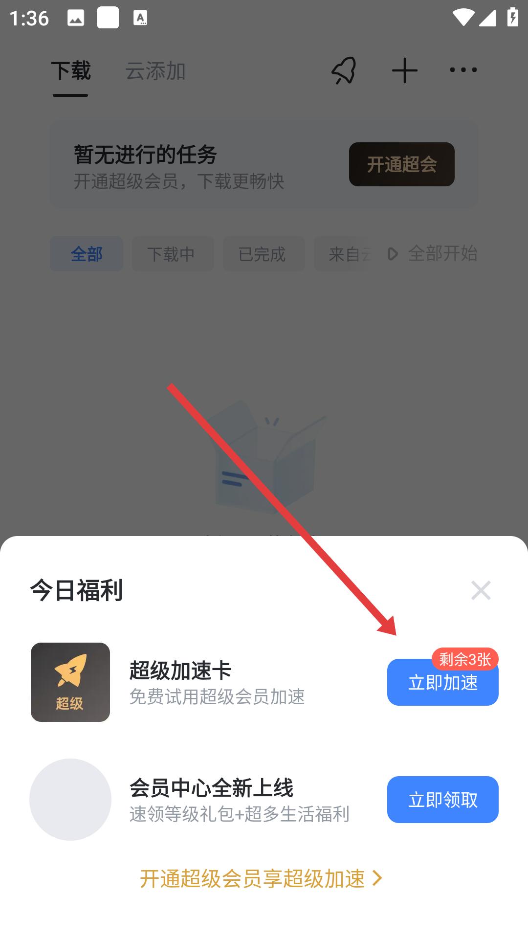 1、打開迅雷云盤app,進入下載頁面看到開通超會按鈕,點擊該按鈕,彈出今日福利提示框,展示超級加速卡等福利內容。