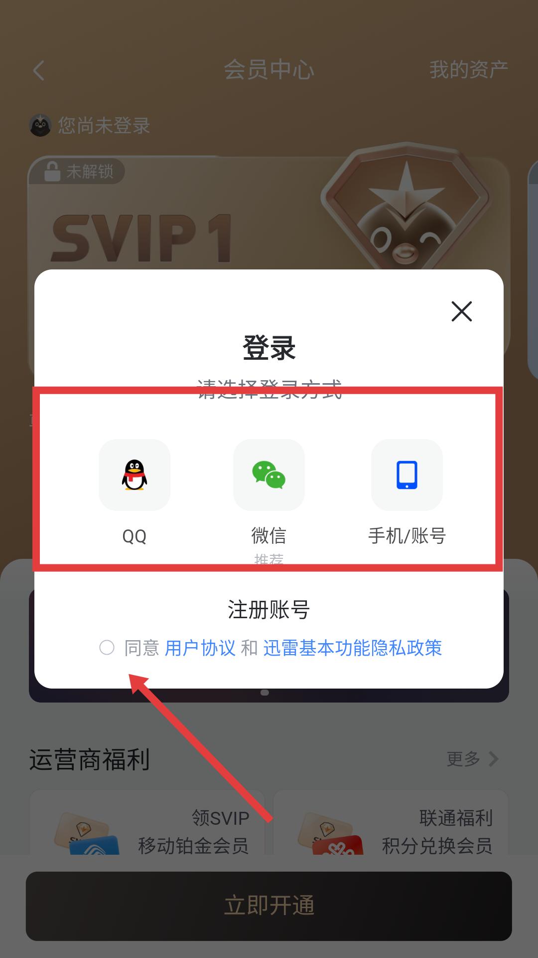 4、在登錄窗口中選擇合適的登錄方式,勾選同意用戶協議和迅雷基本功能隱私政策,進行登錄操作,完成后可繼續開通會員流程。