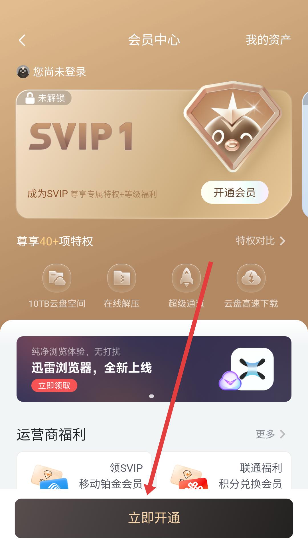 2、在今日福利提示框中點擊相關開通會員入口,進入會員開通頁面,頁面展示SVIP權益及立即開通按鈕。