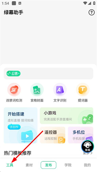 1、打開綠幕助手APP,進入工具板塊,可看到檢測、宮格封面等功能入口,還有虛擬直播提詞拍攝的搭建入口和熱門模板推薦,能滿足多種創作需求。