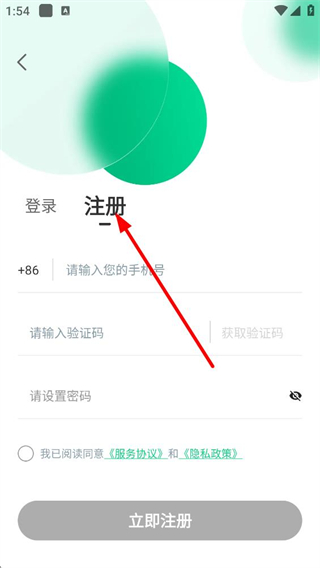 4、新用戶注冊時,輸入手機號,獲取并輸入驗證碼,設置密碼,勾選同意服務協議和隱私政策后點擊立即注冊,即可完成賬號注冊。