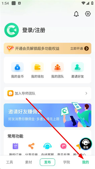2、點擊底部我的按鈕,進入個人中心界面,可看到登錄、注冊入口,還有我的金幣、我的錢包等功能選項,便于管理個人相關信息和權益。