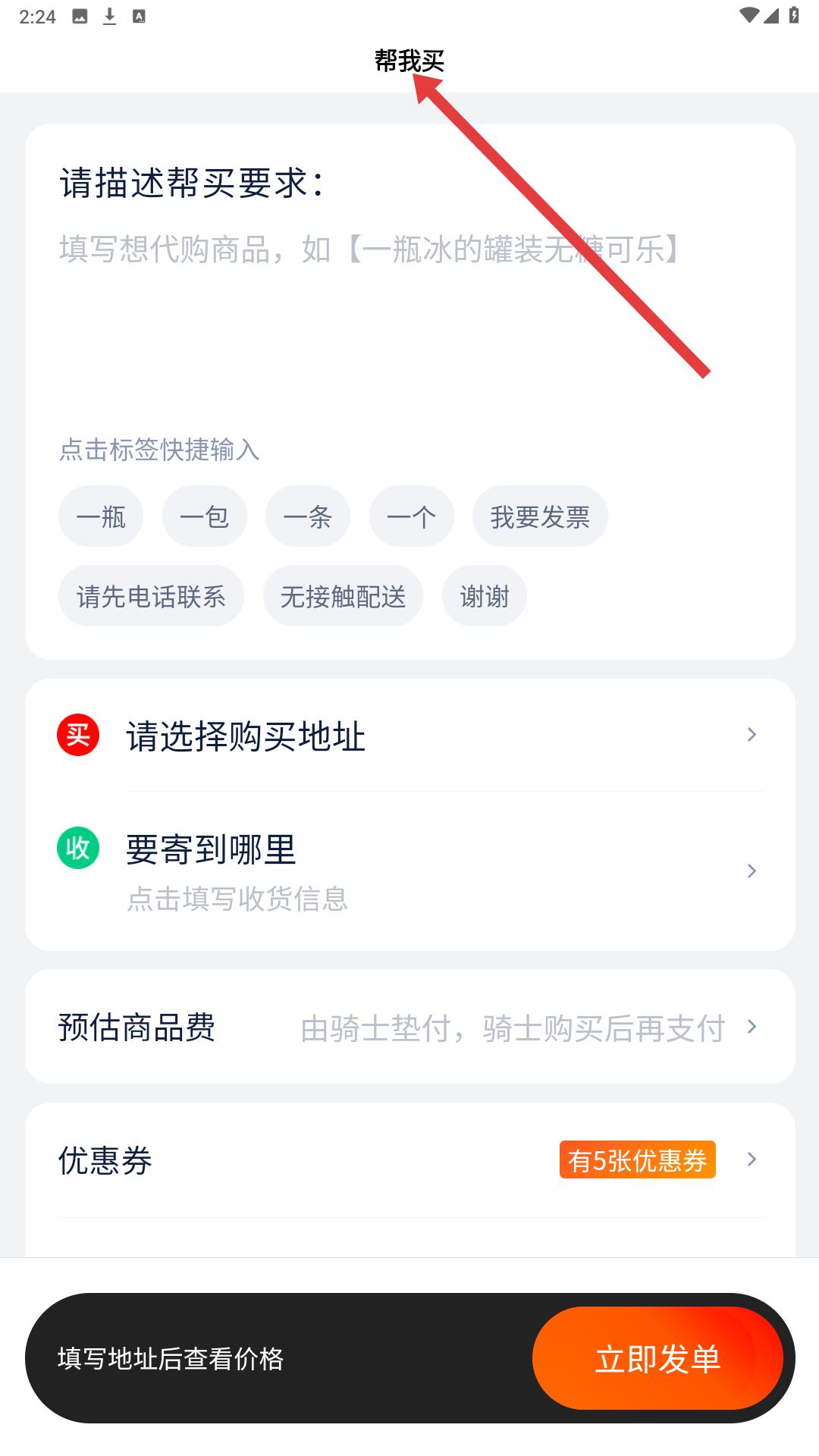 3、此外,還可選擇幫買服務,進入幫買頁面后,填寫幫買要求,選擇購買地址和收貨地址,完善信息后可立即發單。
