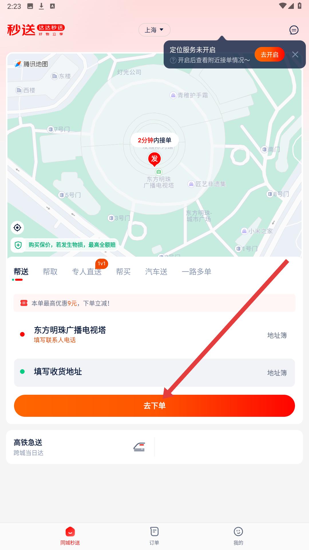 1、進入達達秒送首頁,可選擇幫送服務,填寫發貨地址如東方明珠廣播電視塔和收貨地址,點擊去下單可進入發貨信息填寫頁面。