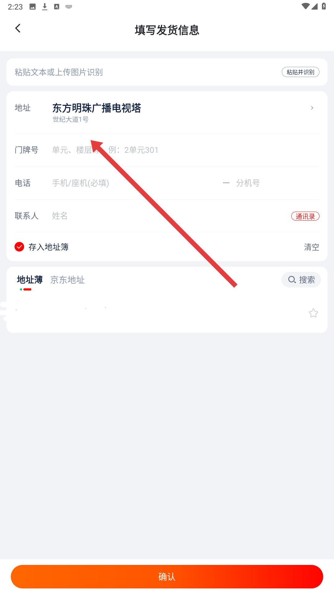 2、填寫發貨信息頁面,需完善地址的門牌號、電話、聯系人等信息,填寫完成后可存入地址簿,方便后續使用。